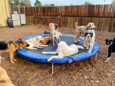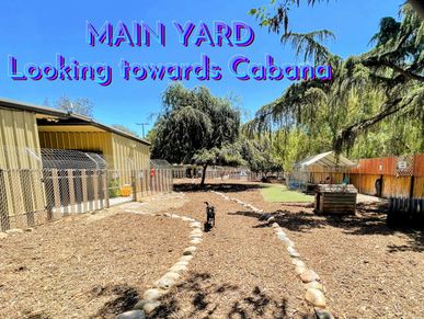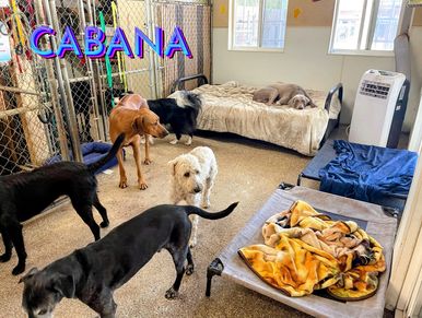 Cot beds are scattered throughout the yards, a big trampoline and doggy play station are also in the yard for dogs to play on. All dogs have access to a large building we call the Cabana, where they can get out of the heat or the cold and rest in a climate-controlled setting.