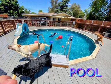 We also have an above-ground pool that is 4’ deep, located in a completely fenced area and always monitored by staff members when in use. The pool is a huge hit with the dogs! For those dogs who are not swimmers, we also provide kiddy pools in the yard. For safety, we have a clicker-controlled wrought iron gate at the entrance of the facility, as well as a nice parking lot for customers to use.